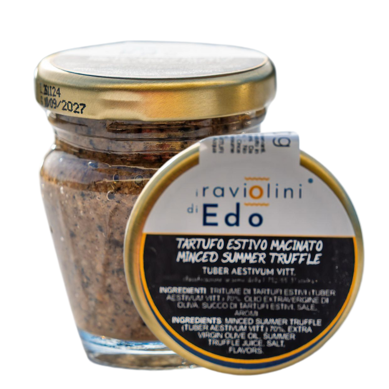 | Ingredienti/Ingredients | Tritume di tartufo estivo (Tuber Aestivum Vitt.) 70%, olio extravergine di oliva, succo di tartufi estivi, sale, aromi. Minced summer truffle (Tuber Aestivum Vitt.) 70%, extra virgin olive oil, summer truffle juice, salt, flavors. |